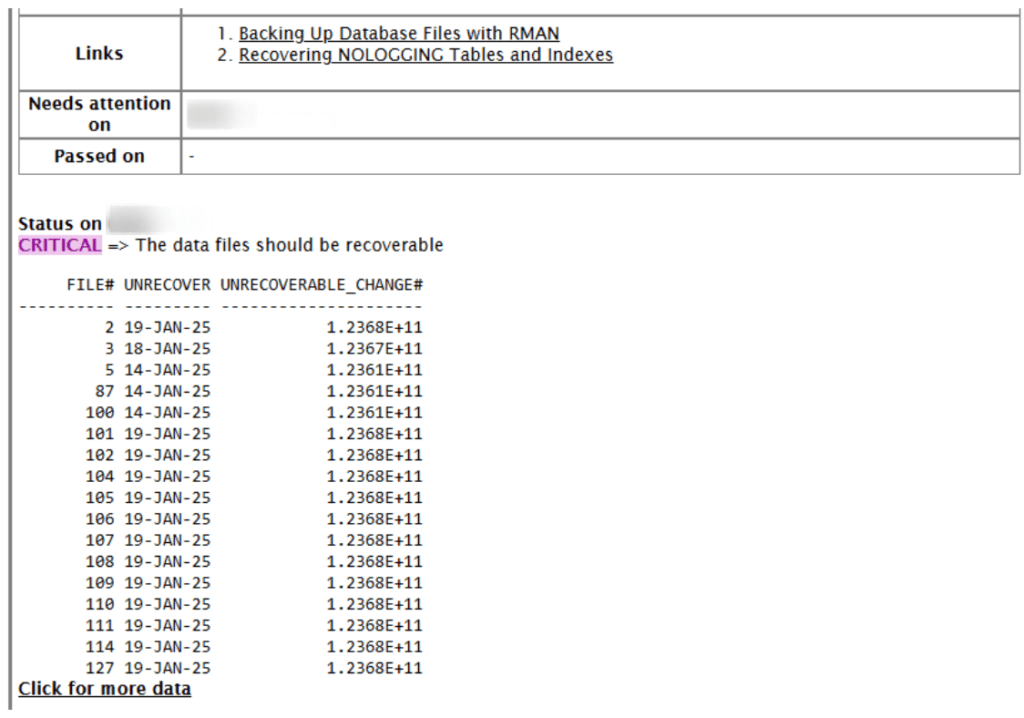 Durante a execução do ORAchk em um banco de produção, foi identificado que alguns datafiles apareceram como não recuperáveis. Neste ambiente, o forcing log não estava ativado, permitindo operações diretas como cargas SQL*Loader ou DMLs paralelas sem geração de redo logs. Esse cenário é esperado, mas exige atenção, pois os datafiles podem estar em risco caso não existam backups recentes.