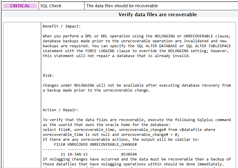 SQL> O resultado da consulta apontado pelo ORAchk é considerado um problema porque indica que alguns datafiles possuem valores no campo unrecoverable_time. Isso significa que foram realizadas operações não recuperáveis nesses datafiles, e o ORAchk interpreta que essas alterações podem estar sem proteção caso não tenha sido feito um backup após essas operações.