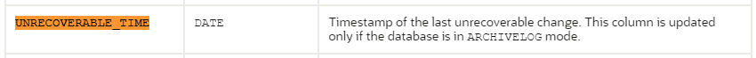 Ao consultar a documentação oficial do Oracle sobre unrecoverable_time na visão V$DATAFILE, temos o seguinte:
