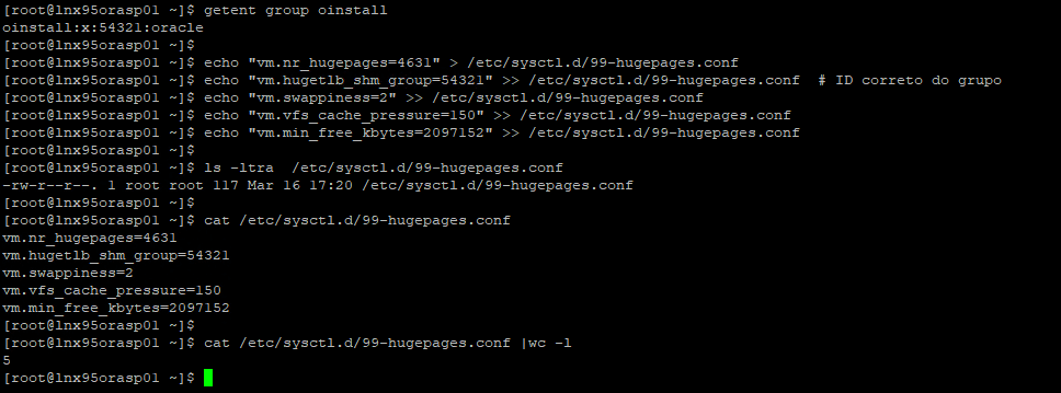 [root@lnx95orasp01 ~]$ echo "vm.hugetlb_shm_group=54321" >> /etc/sysctl.d/99-hugepages.conf  # ID correto do grupo