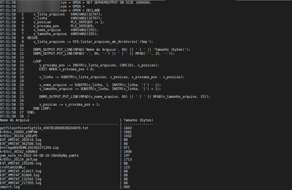 \n), é percorrida em um loop. Durante o loop, cada nome de arquivo e seu respectivo tamanho são extraídos e impressos usandoDBMS_OUTPUT.PUT_LINE. - Exibição da Saída: Com o