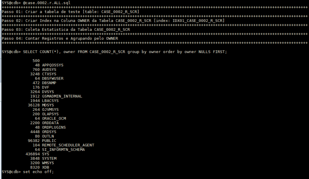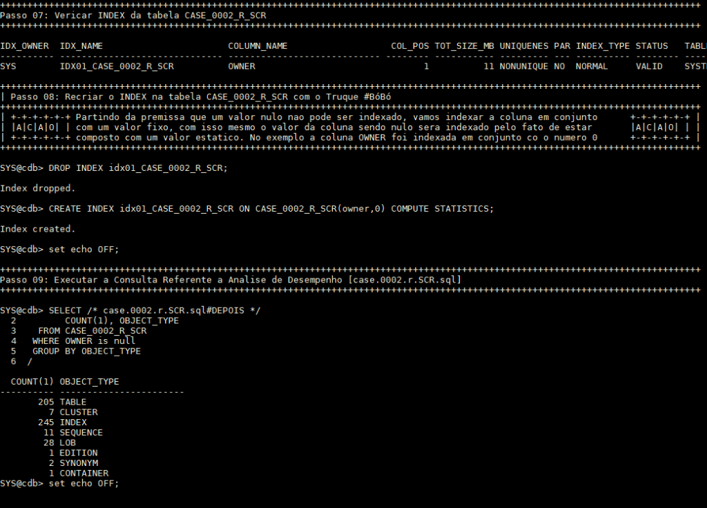 CREATE INDEX idx01_CASE_0002_R_SCR ON CASE_0002_R_SCR(owner, 0) COMPUTE STATISTICS;Esse INDEX forçou o Oracle a considerar a expressão owner, garantindo que todas as linhas, incluindo aquelas onde OWNER é nulo, fossem indexadas.