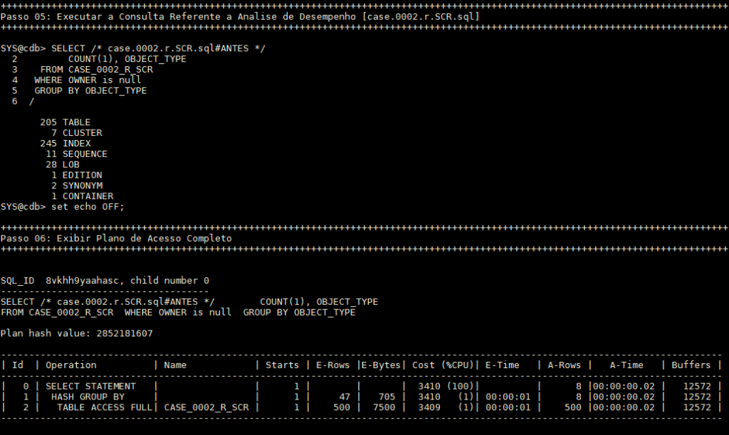 TABLE ACCESS FULLindica que o Oracle escaneou toda a tabelaCASE_0002_R_SCR. - Cost (%CPU): O custo foi de 3410, indicando um processo intensivo em termos de recursos.