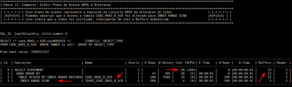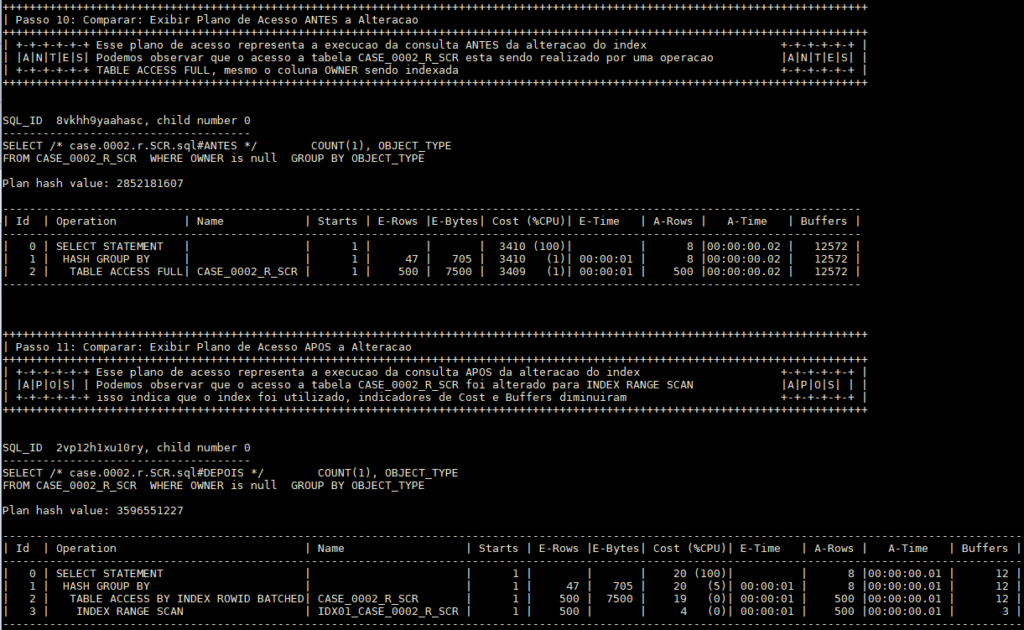 INDEX RANGE SCANnoIDX01_CASE_0002_R_SCRmostra que o Oracle usou o novo índice para acessar os registros. - Operation (Id 2):