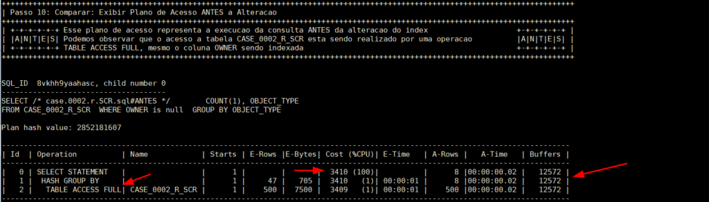 Durante a análise do problema, identificamos o sqlid ofensor e que o mesmo não estava utilizando um índice existente. Isso foi um indicativo claro que algo precisava ser ajustado para melhorar o desempenho.